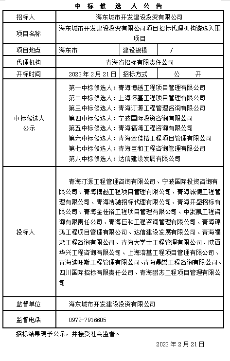 海東城市開(kāi)發(fā)建設(shè)投資有限公司項(xiàng)目招標(biāo)代理機(jī)構(gòu)遴選入圍項(xiàng)目中標(biāo)候選人公示