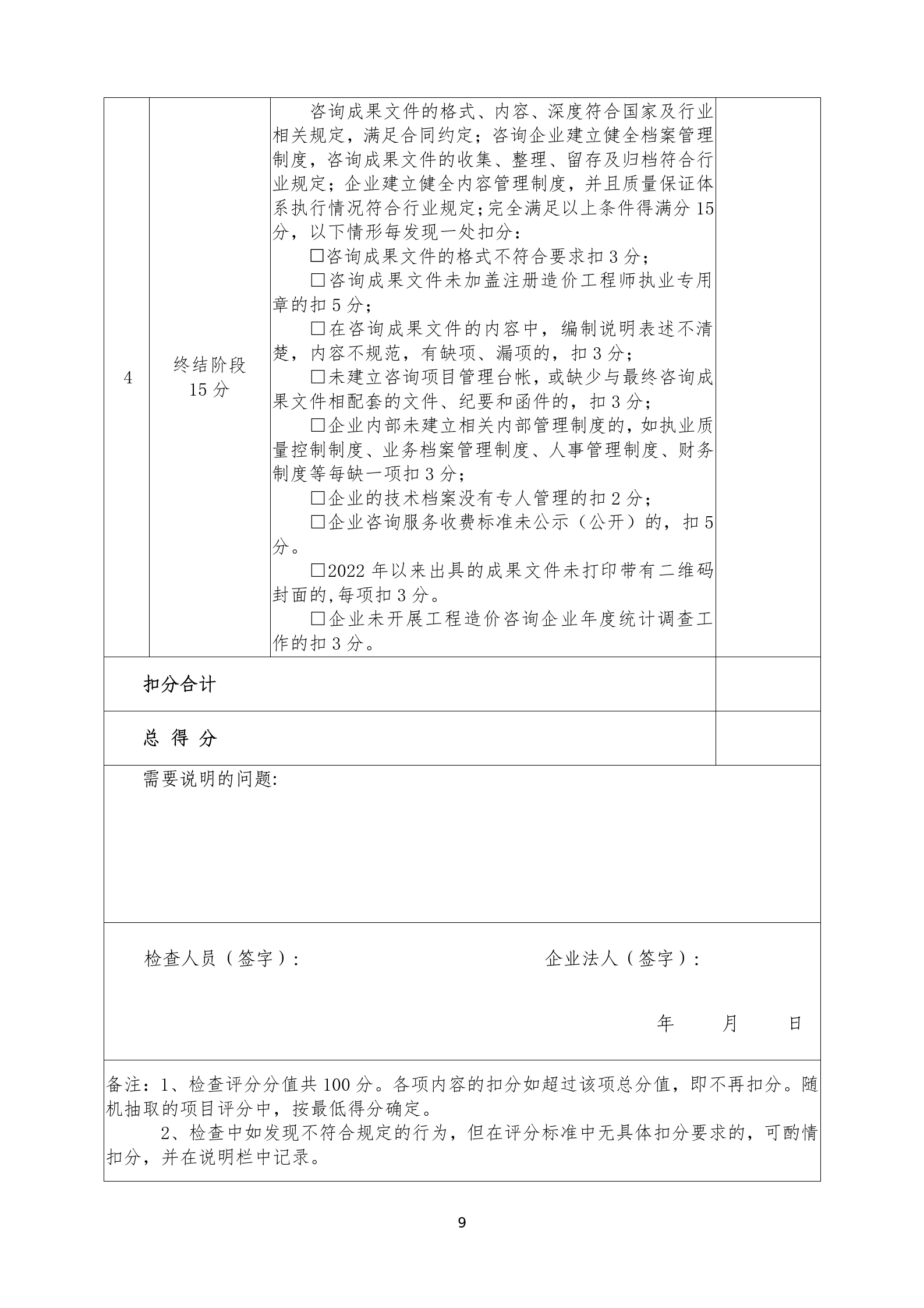 (三)不合格:工程造價(jià)咨詢企業(yè)發(fā)生過相關(guān)禁止的違法、違規(guī)行為;存在逾期未整改、整改后仍不合格,或咨詢成果文件專項(xiàng)檢查分值在60分以下的。