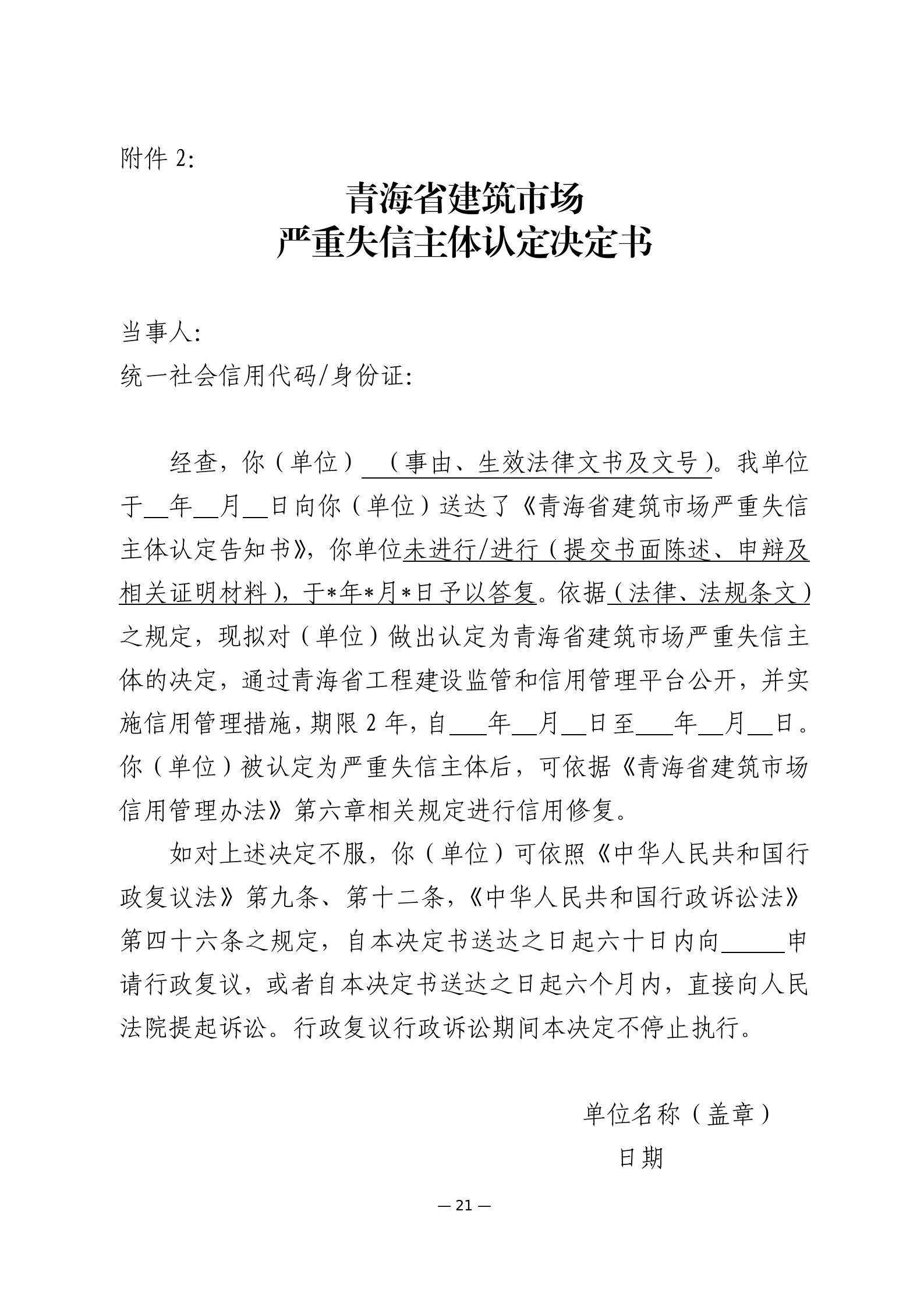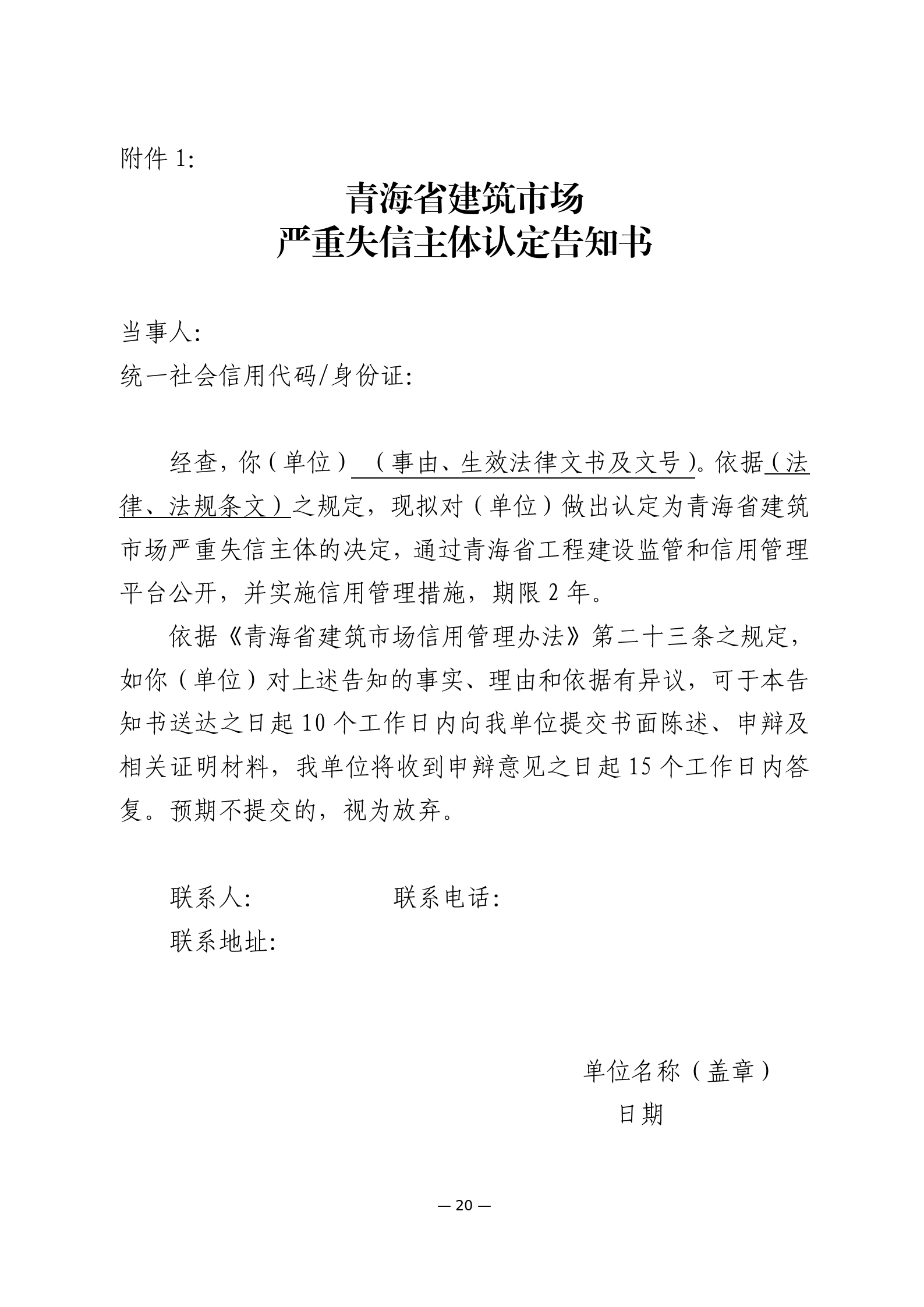 (一)經(jīng)發(fā)現(xiàn)存在建筑市場嚴(yán)重失信主體認(rèn)定標(biāo)準(zhǔn)的,應(yīng)當(dāng)向建筑市場主體送達(dá)《青海省建筑市場嚴(yán)重失信主體認(rèn)定告知書》(附件1),告知書載明認(rèn)定的理由、依據(jù)、懲戒措施和建筑市場主體享有的陳述、申辯權(quán)利。