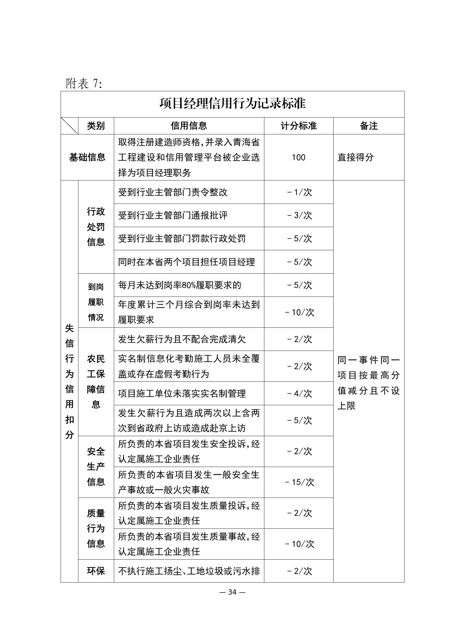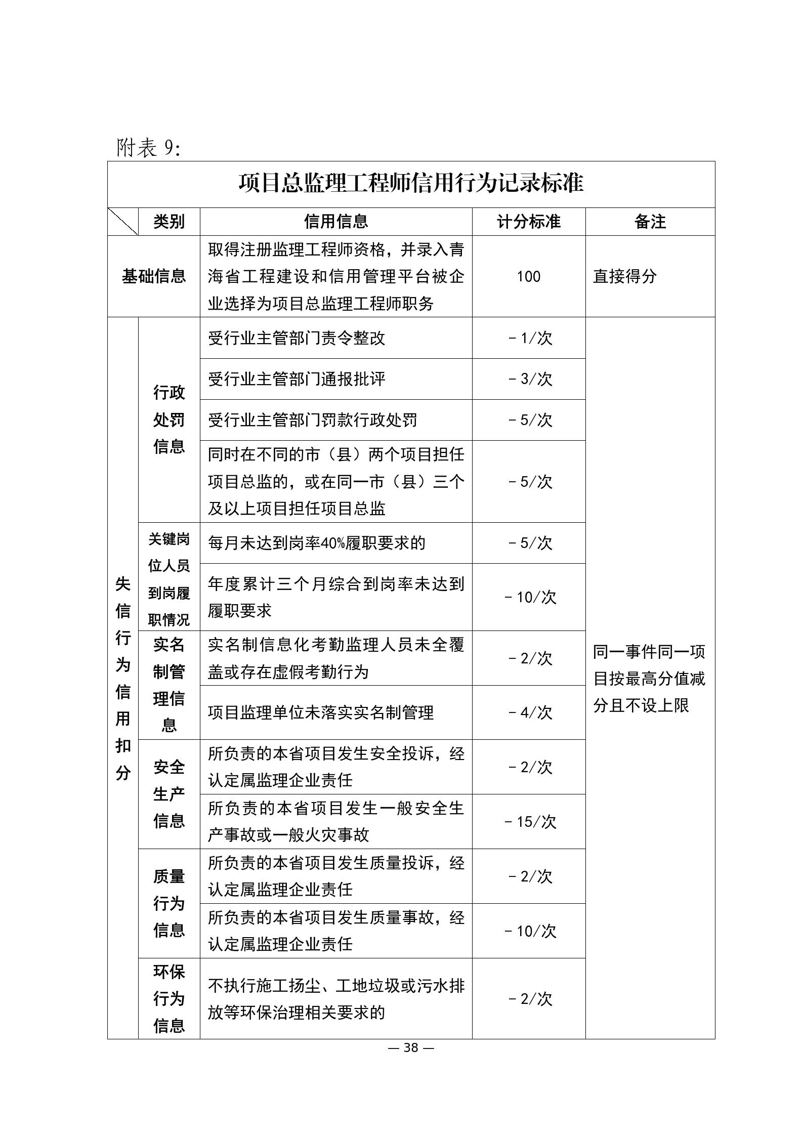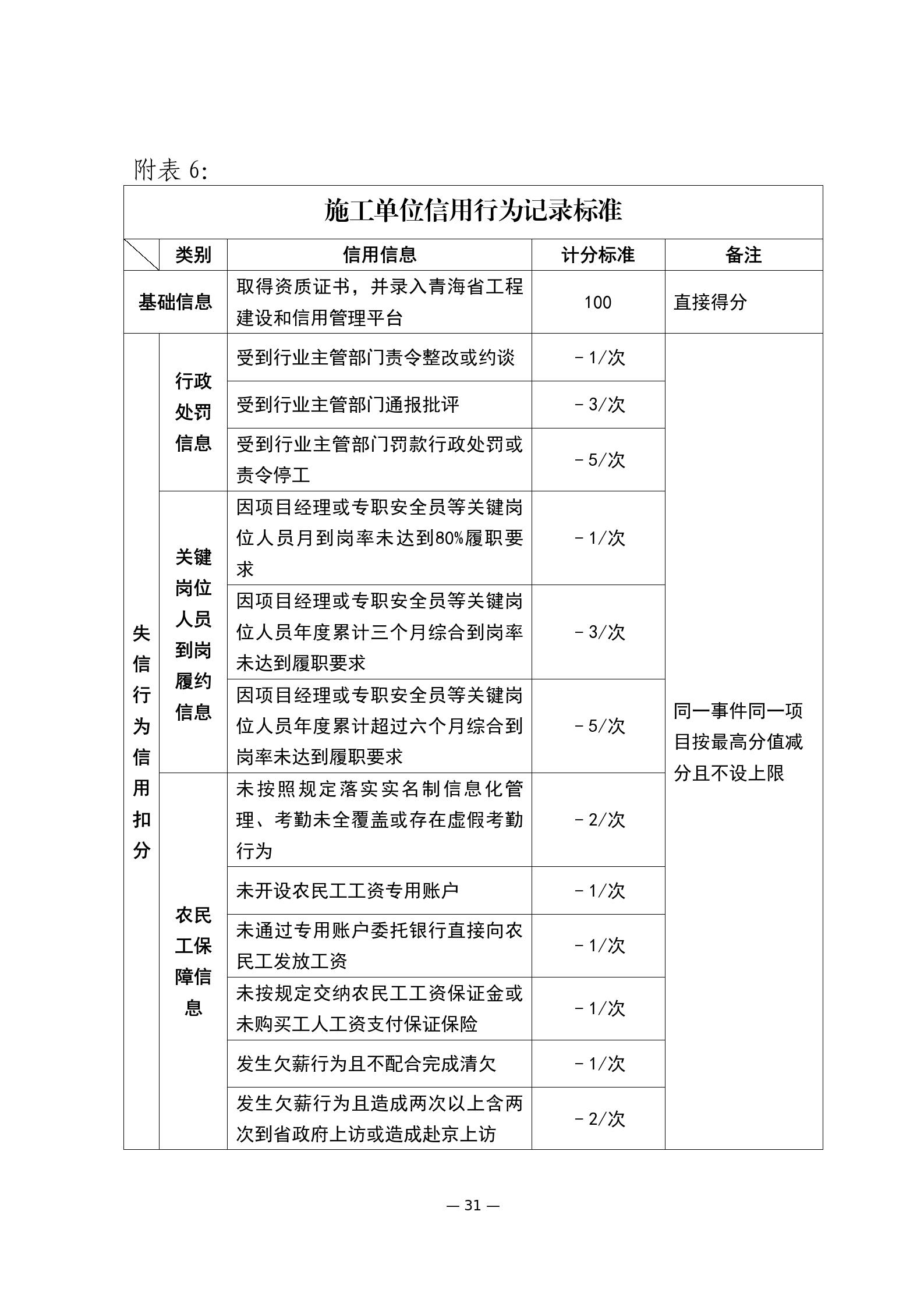 第十六條 建筑市場各方主體和從業(yè)人員的信用評價(jià)實(shí)行信用記錄、守信獎(jiǎng)勵(lì)和失信行為動態(tài)記錄記分制。根據(jù)《青海省建筑市場各方主體和從業(yè)人員失信行為記分標(biāo)準(zhǔn)》(附件)進(jìn)行公開展示和記分。基礎(chǔ)分100分。