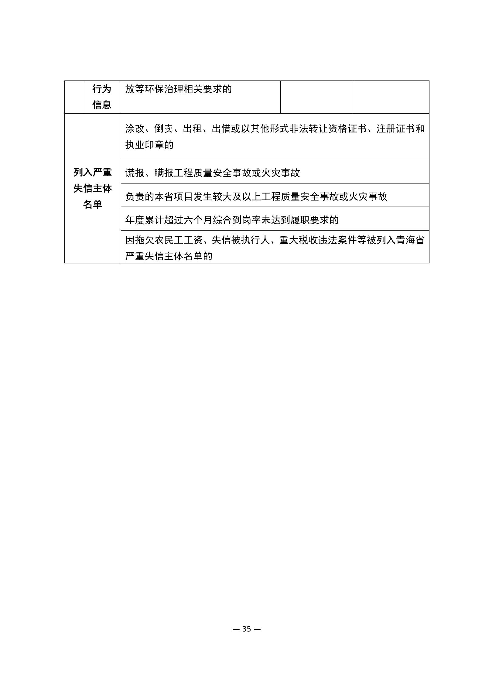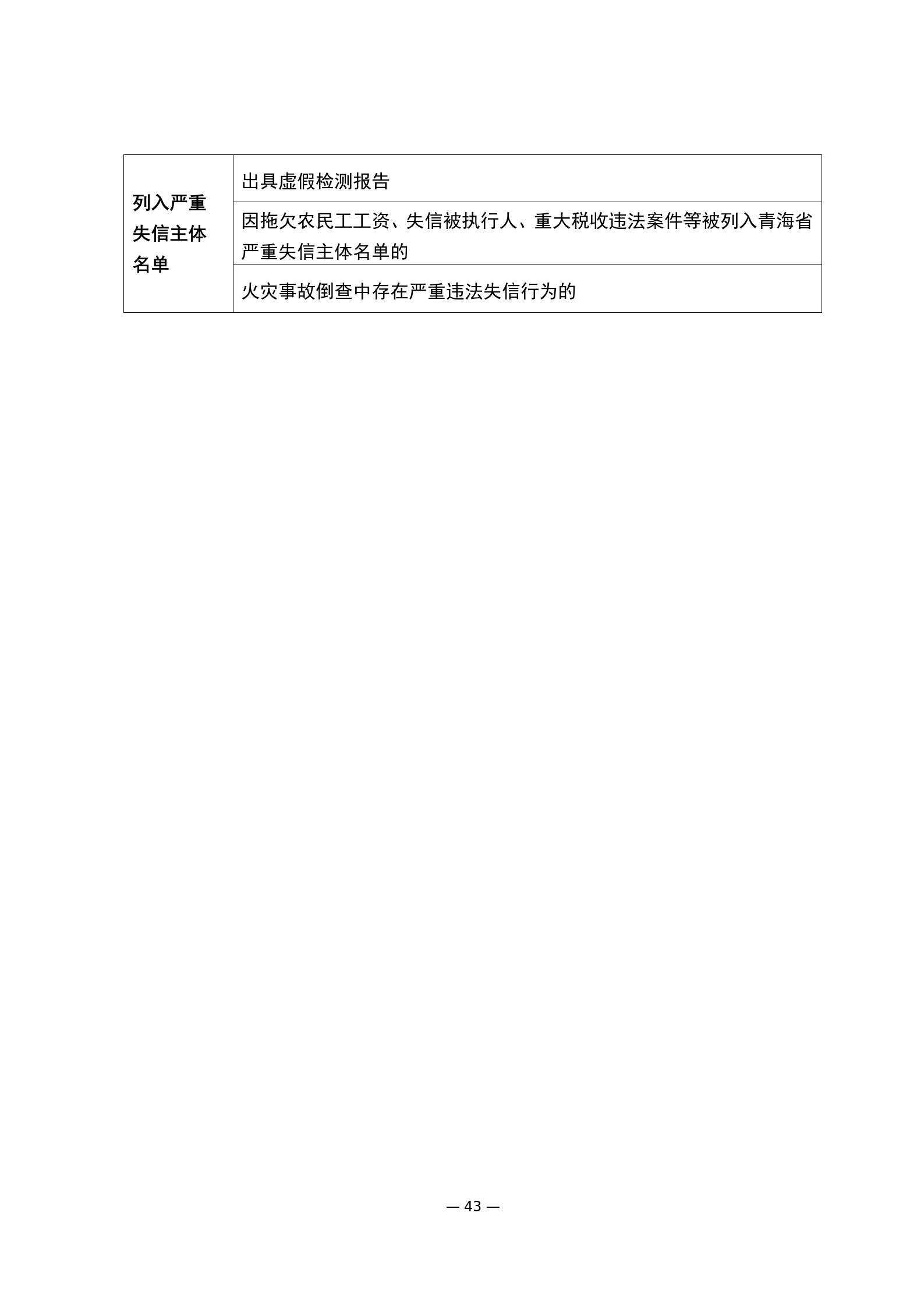 (一)在非國有投資項(xiàng)目中,建設(shè)單位不應(yīng)選用建筑市場主體嚴(yán)重失信主體名單的企業(yè)和從業(yè)人員參與工程建設(shè)活動;24個(gè)月內(nèi)取消其參與政府投資項(xiàng)目工程建設(shè)活動資格;省外進(jìn)青企業(yè)24個(gè)月內(nèi)不受理進(jìn)青登記業(yè)務(wù);